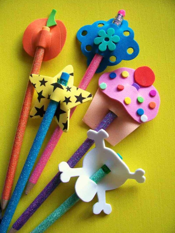 El último trabajo con goma EVA que quería explicarte hoy es cómo hacer tus propios adornos para tus lápices. Esta es una manualidad perfecta para hacer con niños. En alguna de esas tardes de invierno en las que es imposible llevarlos a jugar al parque, saca la goma EVA y anímales a hacer estos divertidos adornos. Los tendrás encantados y entretenidos un buen rato, y la casa (y los vecinos) podrán recuperar algo de paz… aunque solo sea durante un tiempo.