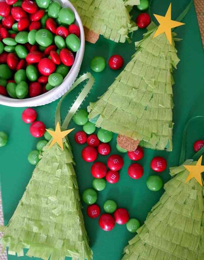 Esta idea pone en común dos elementos que les encantan a los niños: los adornos para el árbol de Navidad y las piñatas llenas de chuches y golosinas. Se trata de unos pequeños árboles de cartulina que son también unos pequeños contenedores de chuches.