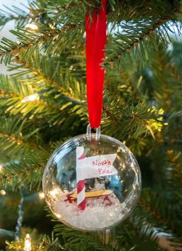 Aquí tienes otra idea sobre decorar las bolas navideñas con diferentes elementos en su interior. Estos nos traen recuerdos del Polo Norte. A continuación puedes ver cómo se hace el trabajo completo. ¡Verás qué fácil!