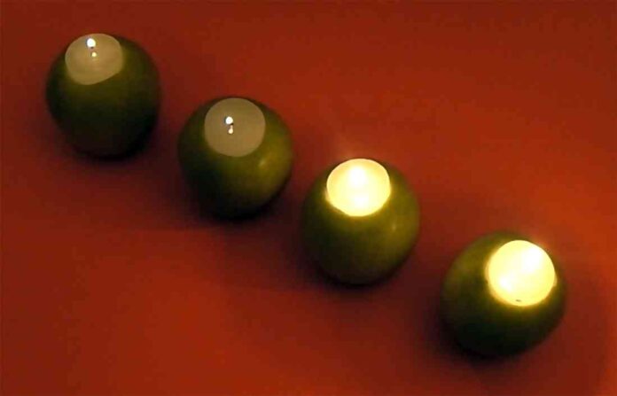 Una vez que lo tengamos hecho, añadimos las manzanas a la base que hemos cogido y les introducimos sus respectivas candelitas.