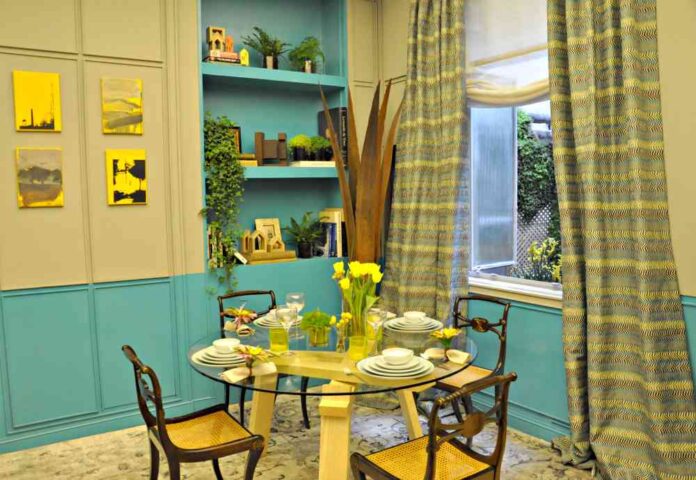 Cuadros amarillos que combinan con las flores sobre la mesa y el asiento de las sillas, paredes azul cielo y beis con un toque de verde, combinan a la perfección con el estampado de las largas cortinas de la ventana.