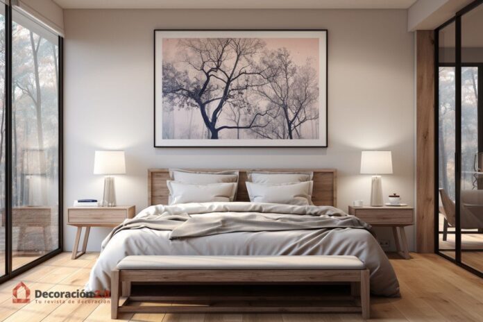 En conclusión, la decoración de habitaciones con arte de pared es una manera efectiva de añadir elegancia y sofisticación a cualquier espacio. Esta imagen nos invita a explorar las posibilidades del arte en la decoración, resaltando cómo una simple pieza puede cambiar la percepción y el ambiente de una habitación, creando una estética serena y cautivadora.