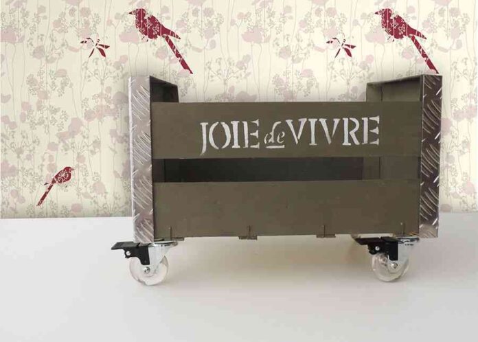 Paso 7. Para darle un toque especial, se ha estarcido en los laterales una frase en francés Joie de vivre, con una plantilla de estarcido, la Chalk Paint en color blanco y un rodillo.