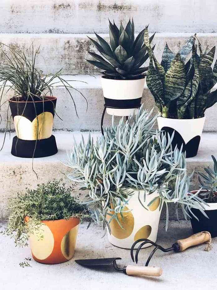 En cuanto a los colores, en este caso se ha optado por utilizar colores elegantes y atemporales: los infalibles blanco y negro. Sin duda, una combinación perfecta, solos y con el dorado. Para pintar las macetas utiliza un cepillo de espuma y no te quedarán marcas de brochazos.