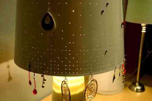 La pantalla de la lámpara está perforada con cientos de agujeros destinados a guardar los pendientes, y además, cuando se enciende la luz atraviesa los agujeros creando un efecto único.