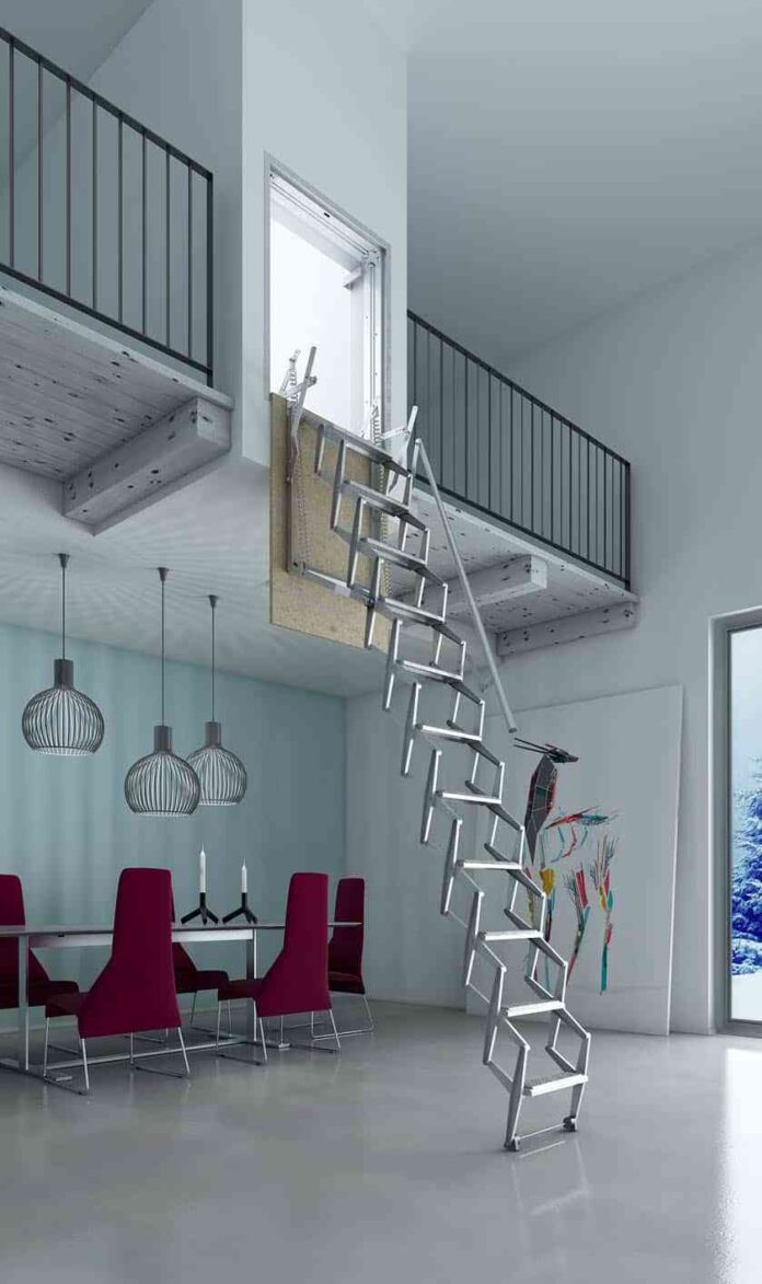 A estas alturas del post está claro que unas escaleras escamoteables pueden encajarnos de maravilla. Ocupan lo mínimo, se esconden para no ser vistas y encima no son antidecorativas pues sus diseños incorporan materiales de alta calidad que estéticamente no desentonan en los ambientes. Los modelos de madera son los más cálidos y fáciles de integrar. Pueden ser la opción más interesante si vamos a utilizar las escaleras escamoteables con frecuencia y por ejemplo se han instalado en un salón abierto y moderno, dividido por paredes móviles.