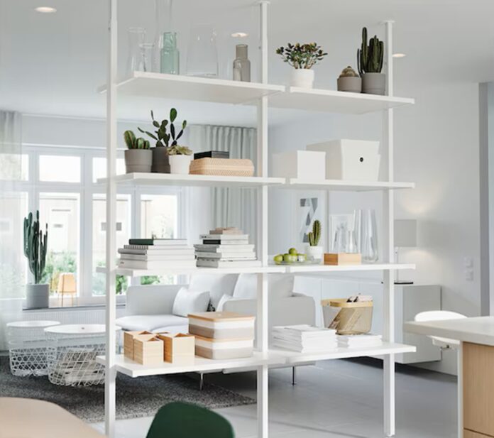 Las estanterías abiertas ofrecen una manera de separar ambientes sin la necesidad de construcciones permanentes o estructuras que puedan obstruir la luz natural. Al estar abiertas por ambos lados, no solo sirven como división, sino que también permiten que la luz fluya libremente.