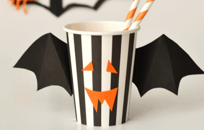 La segunda idea ya requiere tijeras y pegamento pero el resultado vuelve a ser genial. Compra vasos de cartón blanco. Corta tiras negras de la misma anchura y de la altura del vaso. Pégalas, y sobre ellas, coloca los ojos y la boca de una calabaza. Para terminar, recorta unas alas de murciélago de cartulina y pégalas con pegamento por la parte posterior del vaso.