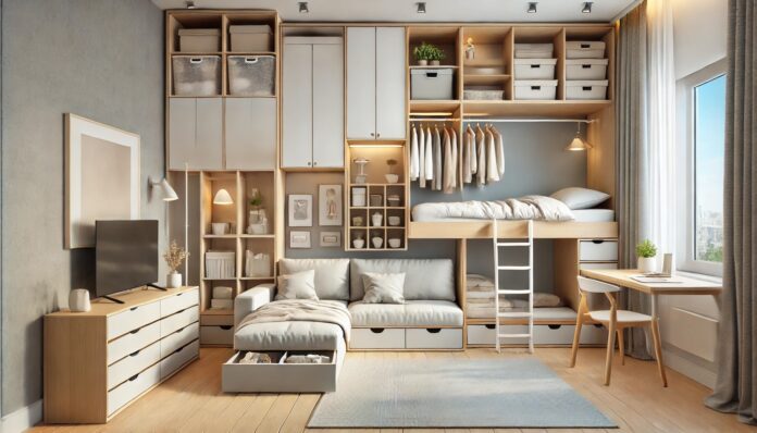 El mobiliario multifuncional es esencial en apartamentos pequeños. Un sofá cama es una excelente opción, ya que puede servir como un cómodo asiento durante el día y transformarse en una cama por la noche. Las mesas de centro con espacio de almacenamiento integrado y los pufs que se pueden usar como asientos adicionales o como almacenamiento oculto son igualmente prácticos. Las camas con cajones o estantes debajo también ayudan a maximizar el espacio disponible.
