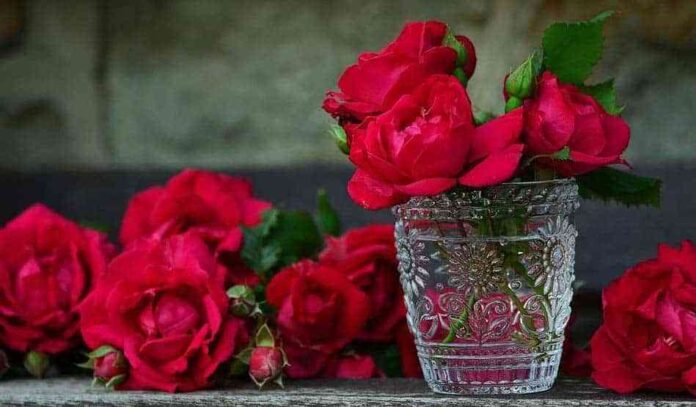 El día 14 de febrero lleva rosas rojas a tu casa. Puedes optar por un ramo de flores de tallo largo colocadas en un estilizado jarrón, un centro formados solo con capullos dispuestos en un recipiente con poco fondo, o simplemente puedes poner un par de rosas en un vaso de cristal labrado, tal como se ve en esta foto de Pixabay: aunque parezca poca cosa, quedan preciosas y tranforman toda una habitación…
