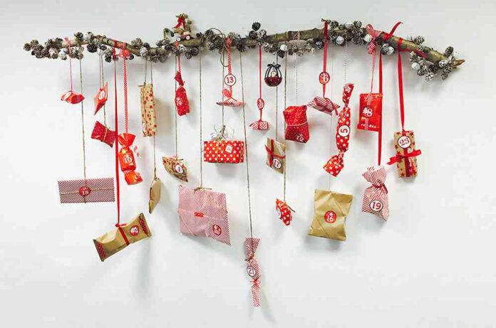 Los materiales necesarios, además de la rama que puedes encontrar al tiempo que te das un buen paseo por el campo, son: papeles de regalo para hacer los paquetitos, números de 1 al 24 para pegar, cintas y cordeles, una o dos guirnaldas y, claro está, 24 sorpresitas o regalos que quieras poner dentro. Vale de todo, desde un caramelo o un bombón hasta un juguete pequeñito, pasando por una moneda para la hucha, unas pegatinas, un lazo para el pelo… Recuerda que la sorpresa del día 24 de diciembre ha de ser la más especial.