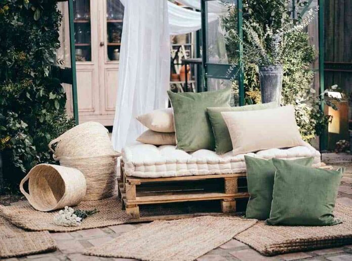 Para crear un rincón con encanto en tu terraza o jardín, echa mano de complementos que le den vida, como todos estos de la firma Muy Mucho. Cubre los palets con una colchoneta mullida y cojines de colores. Y en el suelo, una alfombra de esparto, algunos cestos con plantas… ¡Listo!