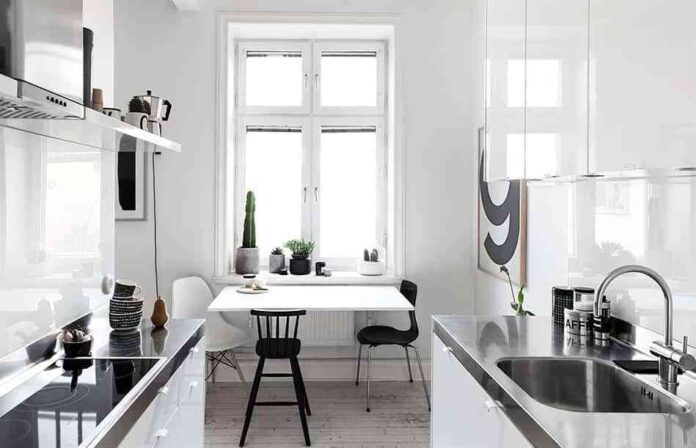 Hay distribuciones de cocina que facilitan mucho el objetivo de disfrutar de un comedor en ellas. Y las de planta rectangular son bastante cómodas para barajar distintas propuestas. Lo habitual en este tipo de cocinas tan funcionales es que se acceda a ellas desde un extremo y que en el otro tengan una ventana, como se ve en la imagen. Pues bien, esta zona puede ser un rincón lleno de posibilidades para adaptar ese ambiente donde organizar nuestras comidas diarias.