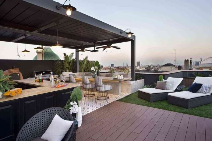 Combinar diferentes pavimentos dará dinamismo y un toque especial a la decoración de la terraza. Una zona con césped artificial, otra con suelo técnico elevado o tarima sobre rastreles, suelos vinilos imitando baldosas hidráulicas…