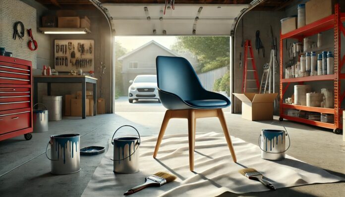 La fotografía capta con realismo el proceso de pintar una silla moderna de color azul en un garaje abierto. La iluminación natural que entra a través de la puerta abierta proporciona una excelente visibilidad, lo que es esencial para un trabajo de pintura preciso y limpio. La silla, colocada sobre una lámina protectora, está lista para recibir una nueva capa de pintura.