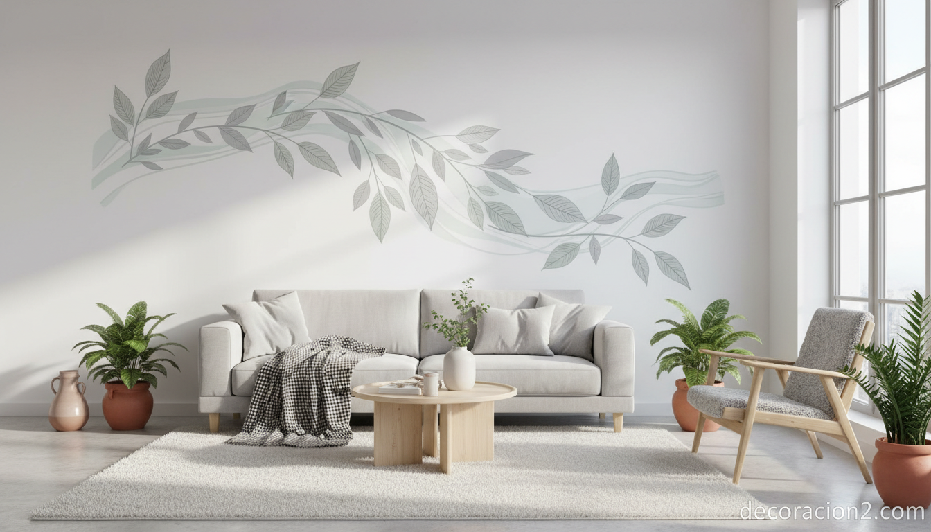 Para salones de estilo nórdico, los vinilos con formas geométricas simples en negro o gris sobre fondo blanco son un acierto seguro. Si el espacio es pequeño, un vinilo con perspectiva o profundidad — como un paisaje, una ventana ficticia o un mural panorámico — puede crear la ilusión de amplitud. Combinado con una buena estrategia de decoración de paredes, el resultado puede ser realmente espectacular.