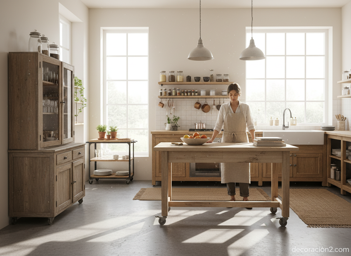 Los armarios exentos, como una alacena antigua restaurada o una vitrina de estilo rústico, añaden personalidad y ofrecen almacenaje extra sin necesidad de reformas. Además, si en algún momento decides reorganizar la distribución de la cocina, estos muebles pueden cambiarse de sitio en cuestión de minutos.