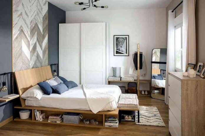 Atrévete a personalizar el cabecero del dormitorio mediante un friso en espigas justo en la pared de atrás. Si lo colocas hasta el techo darás altura visual al espacio de forma elegante y a la vez juvenil. Aprovecha la ocasión para hacer algún cambio más en tu refugio personal y ponerlo al día en tendencias. Tal vez transformar tu cama en un práctico lugar de almacenaje, el suficiente para guardar y tener a mano tus libros de cabecera con estantes abiertos de madera en toda su base. Se acabaron los básicos de casa aburridos.