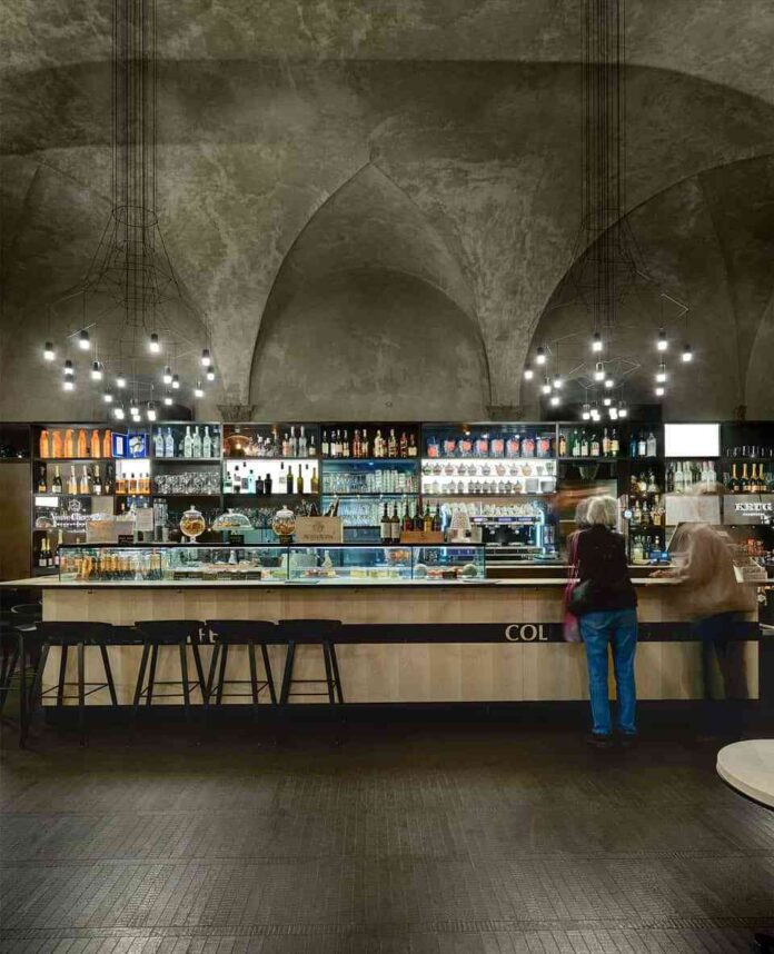 Este restaurante cuenta con un diseño geométrico donde se traza finas siluetas que recuerdan a una tela de araña contra el telón de fondo de los antiguos techos de ladrillo visto. También nos encontramos mesas iluminadas con la lámpara colgante North, que proyectas sombras oscuras que ayudan a definir cada mesa.