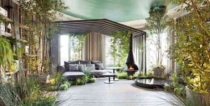 El olivo, como árbol emblemático de la geografía mediterránea, Aves del paraíso gigantes, Kentias y Monsteras convierten la casa en la prolongación de jardines. Como la «Biblioteca en el bosque», donde el equipo de Pia Paisajismo ha creado una atmósfera casi de cuento.