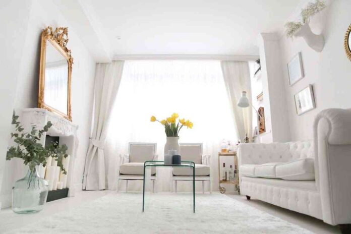 Paredes blancas, cortinas blancas, prácticamente ningún mueble oscuro e incluso… ¡gran alfombra blanca! Sin duda, este salón comenzó siendo un lienzo en blanco en el que pintar con el color de accesorios y complementos en tonos dorados y neutros en su gran mayoría.