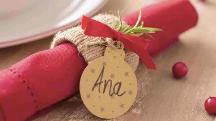 Si no se te dan bien las manualidades siempre puede optar por algo más sencillo como este original y sencillo servilletero compuesto de una rama de romero y una pinza. Personalizalo escribiendo el nombre de los invitados a la mesa de Navidad o de Nochevieja.