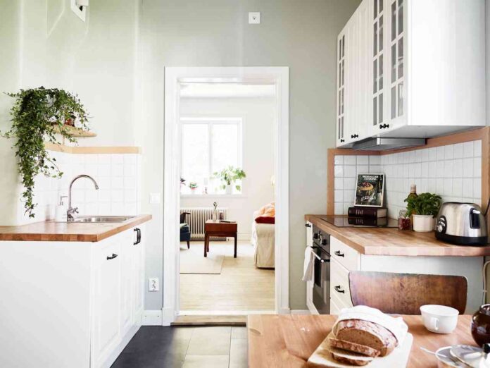 Un elemento realmente destacable es el uso madera en vez de granito en la meseta de la cocina que le da un toque natural y vintage inigualable, y que combina a la perfección con los azulejos blancos y el resto de la estancia.