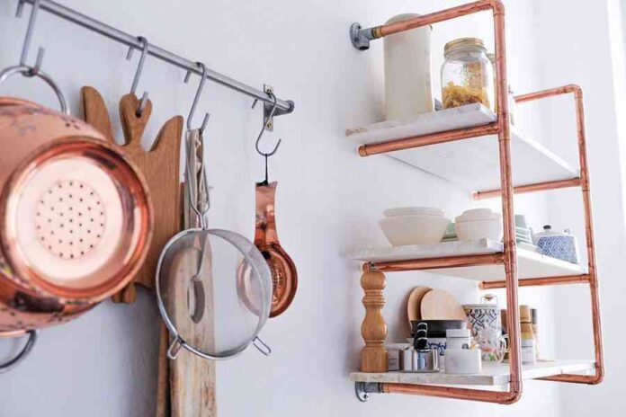 Por eso nos encanta esta idea de realizar una estantería de pared para instalar en la cocina. Necesitas diferentes piezas de cobre para formar la estructura, que después tendrás que sujetar a la pared con los tacos y tornillos adecuados.